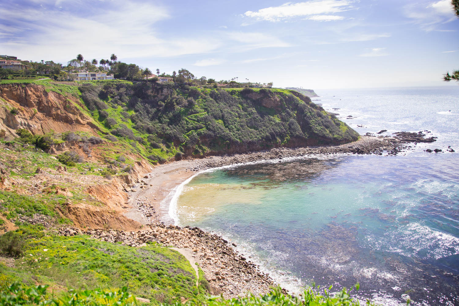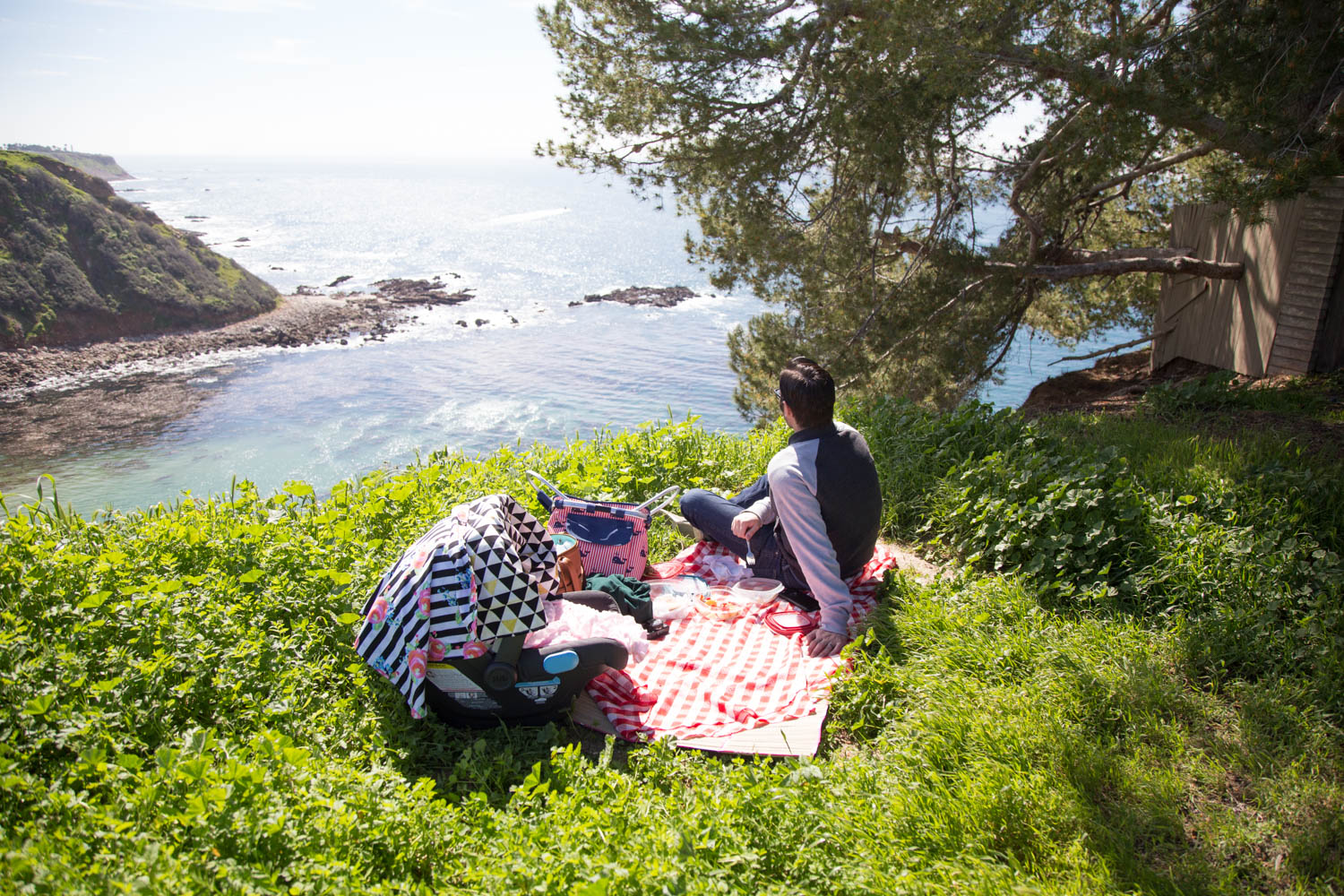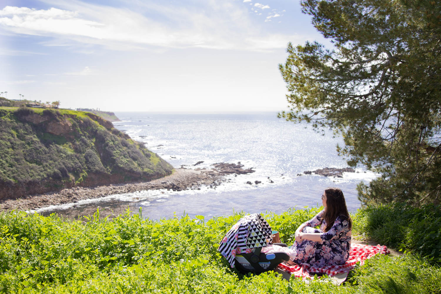 I told Doug that all I wanted for my birthday this year was to go on a family picnic in Palos Verdes so we took a quick trip along the coast to hunt down the best spot overlooking the ocean. One of my goals for 2017 is to get out and explore our area more. If you don’t already know, we aren’t Los Angeles natives. We moved here two years ago from Orange County and still consider ourselves fairly new to the area. LA is HUGE and we live in the southern coastal part of it so there is still so much we have yet to experience and see. I visited Palos Verdes last year on a whim while driving around with Doug and haven’t forgotten its beauty since. It’s right up against a winding two lane road of the pacific coast highway with lush green rolling hills to the left and the bright blue ocean to the right. It’s definitely not something I’ll ever get used to living right by. We pulled up next to some huge Cape Code style houses and I got out to see if this was a good spot to picnic and of course on our first try it was amazing! Our own little private cove to ourselves. This is just one of the many reasons we love living where we do. There was only one other person perched on the cliffside playing his guitar faintly in the distance. It was so picturesque! I can’t wait for Annabelle to experience these moments with us when she’s a little older and not sleeping so much:)