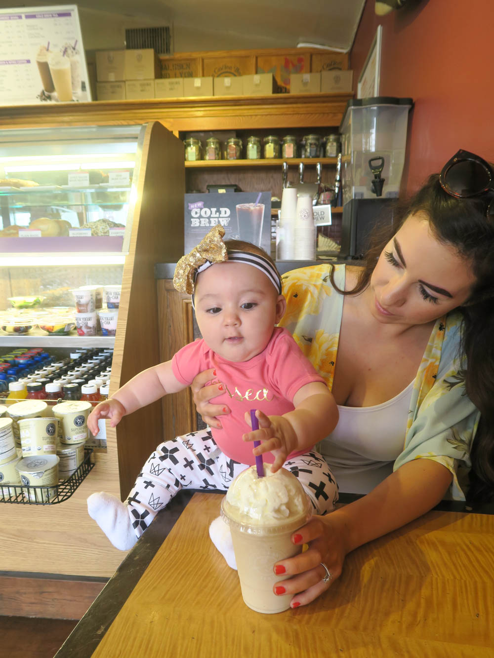 On this particular day, my friend Shelby and I woke up early and took Annabelle to Malibu Farm Pier Cafe, which is one of my favorite places in LA. I love restaurants that sit on the end of piers because the views are beautiful and this one is my favorite because the food is soooo yummy! Even though we ate at 10am we both got lunch;) I’m not really a big breakfast eater. I’d rather have a sandwich! I got a steak sandwich and she got a BLT. So bomb! Also, the ocean is right below our feet and the white clouds behind our plates were intense fog!Of course, because it’s LA everything is grown locally and all organic. I almost got an $8 green juice to be fancy, but decided against it well because…come on $8 for a tiny juice?! Only in LA. I’ve known my friend Shelby since we became twins in our sorority back in 2010 and we’ve been besties ever since! She’s also Annabelle’s Godmother:) I’m obsessed with this kimono from Pink Blush. I wore a nursing tank under it and it’s the perfect postpartum outfit! I’m also in love with white jeans at the moment…now that I can finally fit back into them! The one thing my friend and I LOVE to do when we’re together is getting ice blended hazelnut coffees from Coffee Bean. My absolute FAV! Seriously, you have to try them if you haven’t already. Their hazelnut iced coffees are so good too and the best treat! Annabelle even wanted some;)